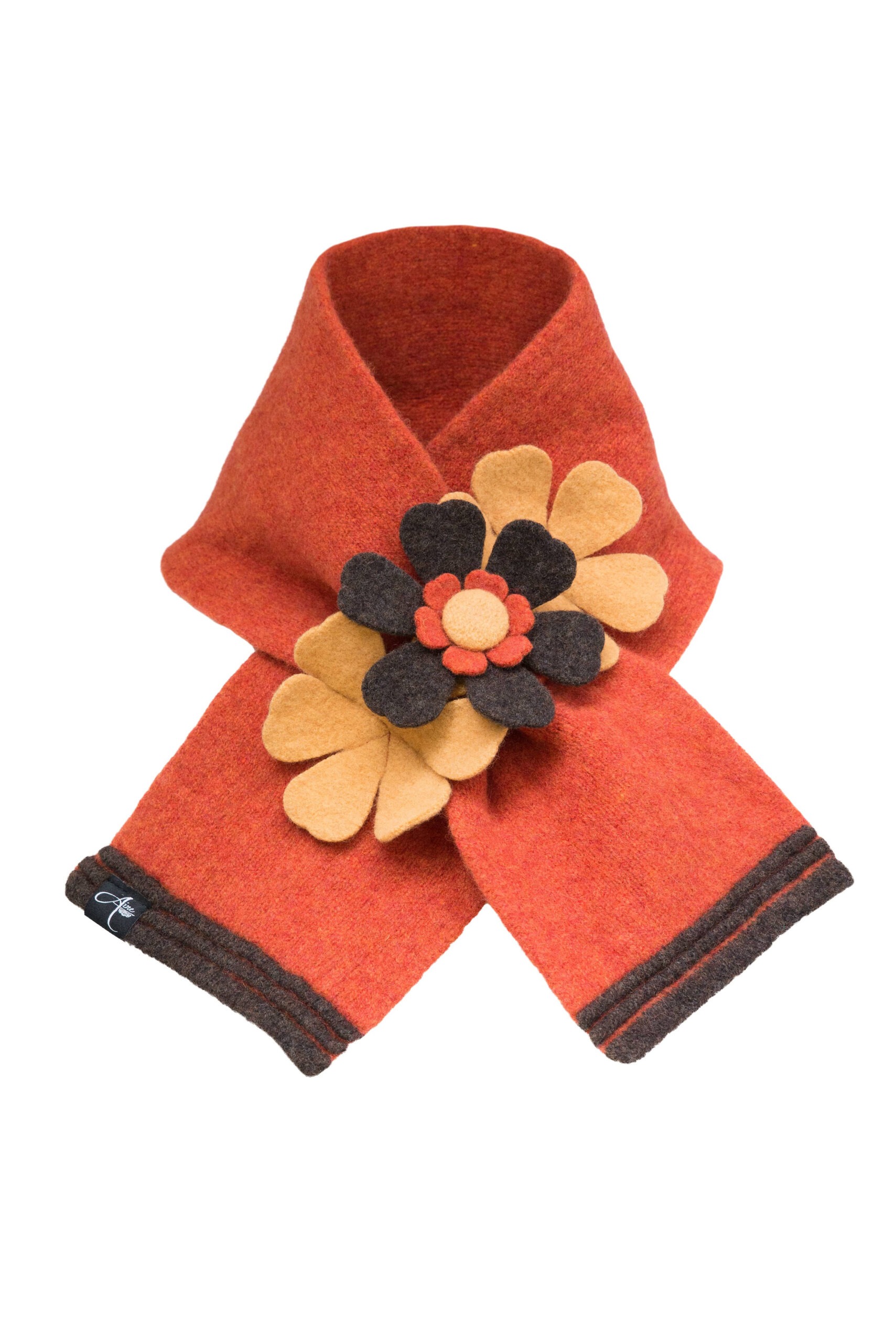 Ladies floral scarf. Knitted in the softest lambswool and lightly boiled for a cosier feel. Ties through a centre loop beneath flower.